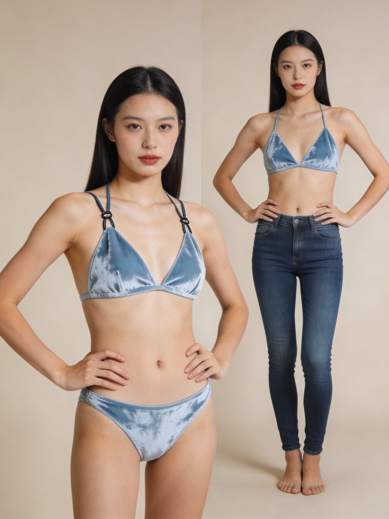 Soft, luxe, and eye-catching. This velvet bikini set brings a unique glow with its smooth finish and cool-toned blue color. Designed for a sleek, minimal look with maximum impact.